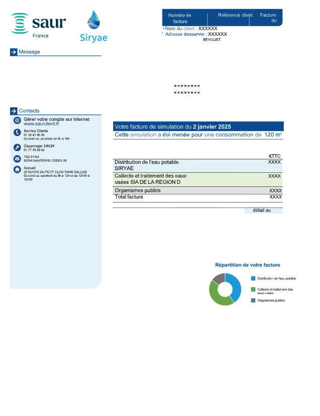 – Part SAUR : exploitation au quotidien des ouvrages et canalisations (personnel, sous-traitance, fournitures, électricité, produits de traitement, analyses, etc.).